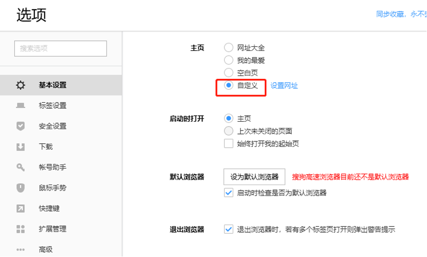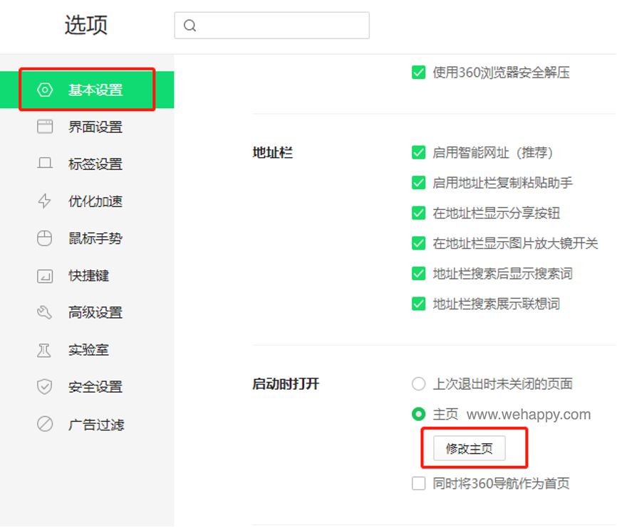3、进入设置界面可以看到“基本设置”选项这里有一个“主页设置”。把主页设置为你想要的网址。然后设置浏览器启动时选中“打开主页”。