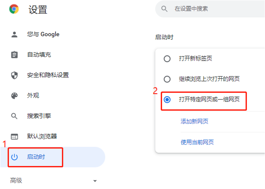 3、找到“启动时”,点击“打开特定网页或一组网页”。