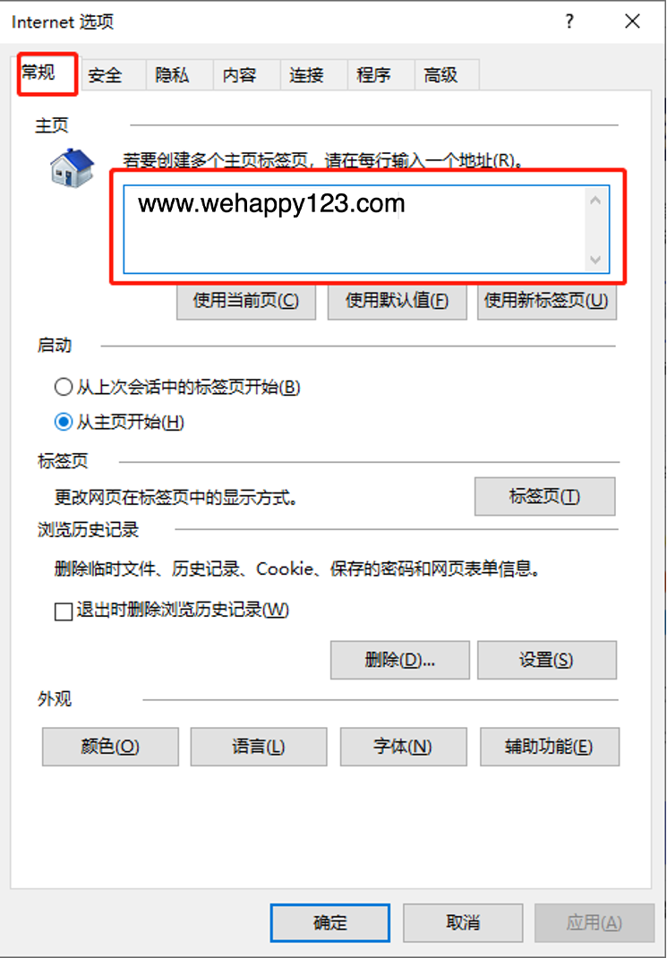 3、在“常规”—“主页”的方框中输入你想设置的网址,如图: